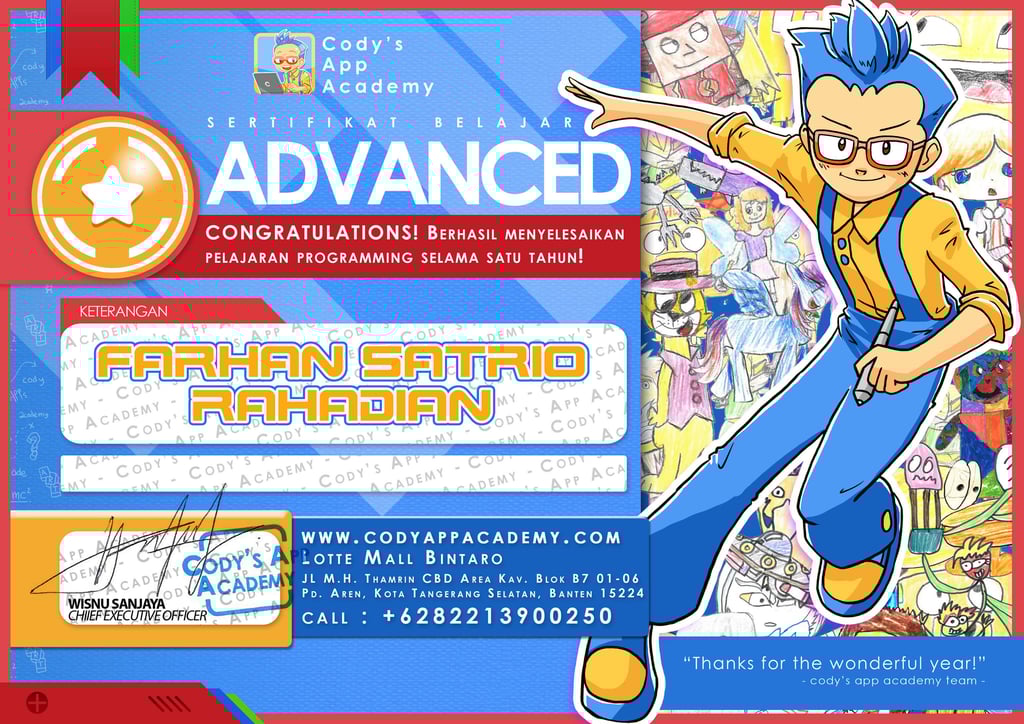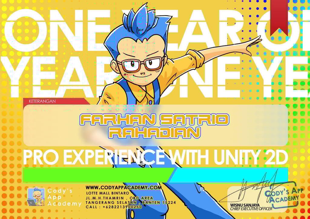 Di Cody's App Academy, Farhan adalah anak yang sangat gigih dalam membangun sebuah karya video game. Dia tidak ragu untuk melakukan eksplorasi kode yang belum dia pahami. Farhan sangat menyukai tantangan dalam pembuatan video game. Dia sangat giat dalam mencari cara supaya fitur yang dia mau bisa dijalankan. Farhan adalah salah satu contoh dari generasi baru game developer Indonesia. Jika dia terus menekuni bidang ini, kedepannya dia akan sangat mudah untuk melakukan adaptasi pada dunia IT atau gamedev profesional.