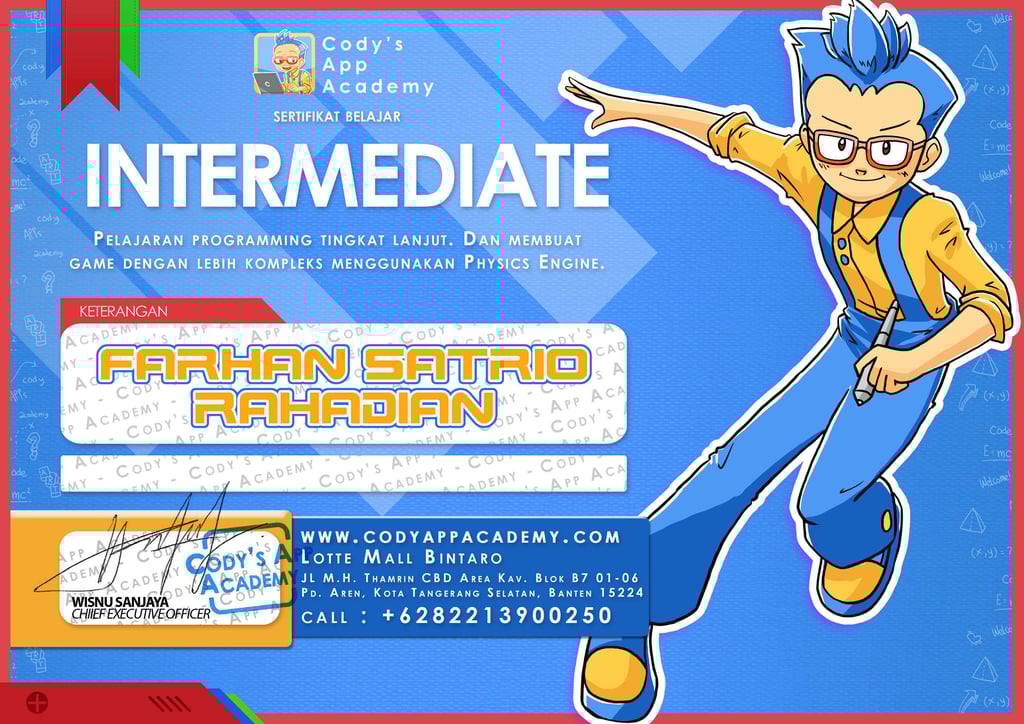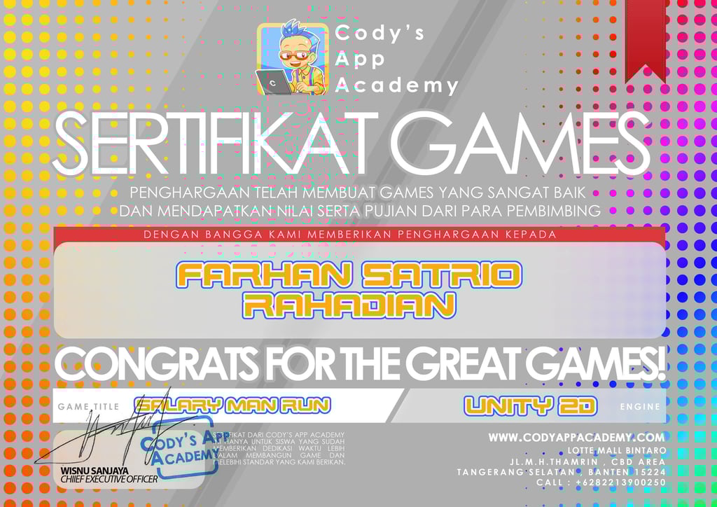 Approved Great Video Games Project. Approved Video Game Showcase at Cody's App Academy Official Video. Approved Video Game : 5 or More. Google Play Store Project (On Going). Juara 2 dalam Kids Coding Competition 2021. Best Video Game Project 2024.