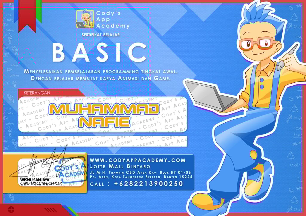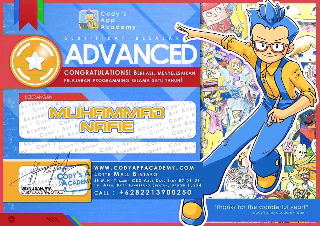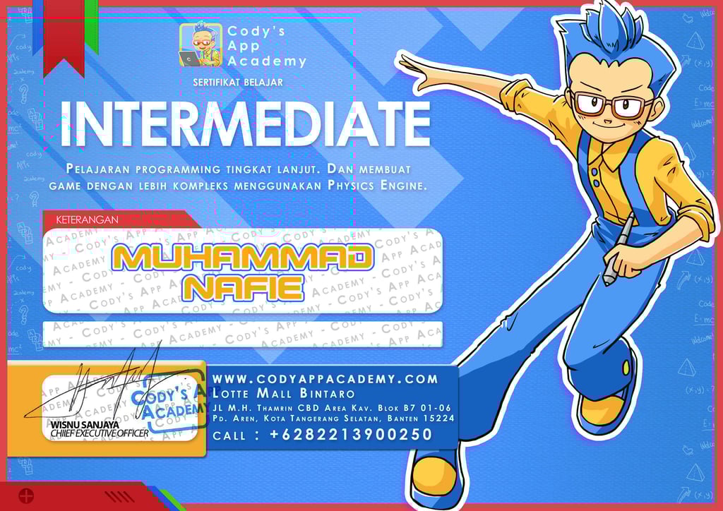 Di Cody's App Academy, Nafie adalah anak yang sudah berevolusi menjadi anak yang tidak mudah menyerah. Dia sering menerima challenge dari trainernya dan mulai merasakan banyak hal yang harus dia perbaiki. Nafie sangat mencoba untuk terus menaikkan levelnya sebagai game developer. Khususnya di bagian coding dan artwork. Team Cody sangat fokus dalam memperbaiki artwork dari Nafie, bisa dilihat dari perubahan kualitas gambarnya yang membaik. Tugas team Cody kedepannya adalah untuk terus meningkatkan level Nafie dan bertanggung jawab akan kualitas dari game buatannya.