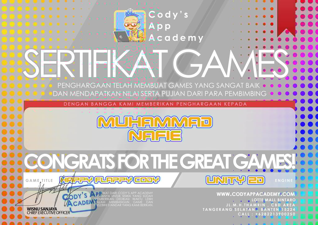 Pada season 1 dengan trainer barunya. Nafie menyelesaikan game Cody Flappy dengan baik. Namun untuk release ke Google Play, masih dibutuhkan polishing di beberapa tempat. Dan statusnya On Hold untuk release di Google Play. Kemudian untuk melanjutkan proses belajarnya, Nafie di season 2 ini sedang membangun project game Uning. Sebuah game yang memiliki gameplay mirip dengan Angry Birds. Nafie sedang membangun assetnya dan engine tahap awalnya. Game ini JAUH lebih sulit dan detail dibandingkan project Flappy sebelumnya. Kami akan memberikan update baru jika sudah ada progress yang lebih lanjut.